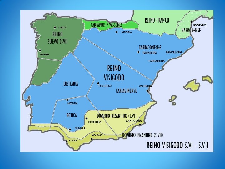 Constantes rivalidades entre reyes, nobles y militares. Siglo VI Bizancio invade sur, sureste y Baleares Leovigildo (573 -586) Domina a los suevos Recupera territorios a Bizancio