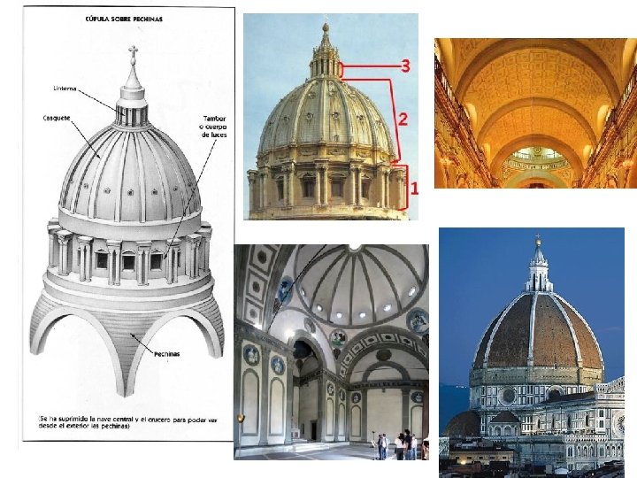 Filippo Brunelleschi (1377 -1446) Su gran obra es la cúpula de la catedral de Santa María de Fiore, en Florencia. En ella, se gestara el espíritu del Renacimiento: un individuo observa una determinada realidad a través del deseo (la antigüedad clásica) para buscar soluciones útiles aplicables a la realidad moderna. Recibió el encargo cuando estaba ya construido el tambor octogonal que lo obligó a dar una solución gótica: una cúpula nervada. En realidad, se trata de dos cúpulas, una dentro de otra pero sin fundir; la interior es semiesférica y la exterior es una cúpula apuntada (I, III).