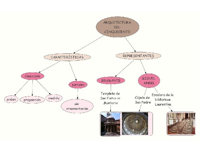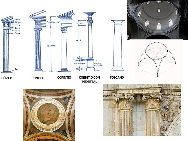 Candelieri Es la típica decoración vegetal en donde se muestran hojas de acanto, cintas, ovas, zarcillos, roleos de curvas y contracurvas, que se aplica principalmente en un sutil relieve dentro de las pilastras o columnas y es empleado también dentro de las capillas de iglesias y catedrales GRUTESCOS es un motivo decorativo derivado de la decoración de las "cuevas" descubiertas en la Roma del siglo XV y que posteriormente se han identificado como habitaciones y pasillos de la Domus Aurea (el palacio que Nerón hizo construir tras el gran incendio del año 64). Fueron muy utilizados en el arte del Renacimiento y se divulgaron por toda Europa. Consiste en la combinación de elementos vegetales[2] ("follajes", guirnaldas), vasijas, cornucopias, [3] panoplias, figuras humanas y teriomórficas ("bichas", centauros, sátiros, putti), animales fantásticos y seres mitológicos ("sabandijas", "quimeras"), mascarones, bucráneos, [4] etc. , que se relacionan de manera caprichosa y rellenan de forma profusa el espacio (horror vacui) en composiciones simétricas. Guirnaldas , medallones …
