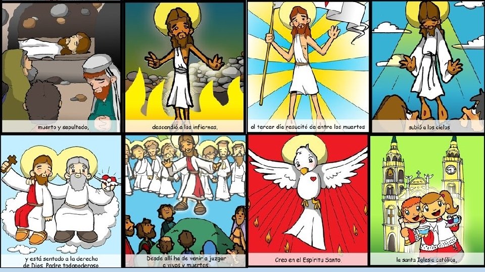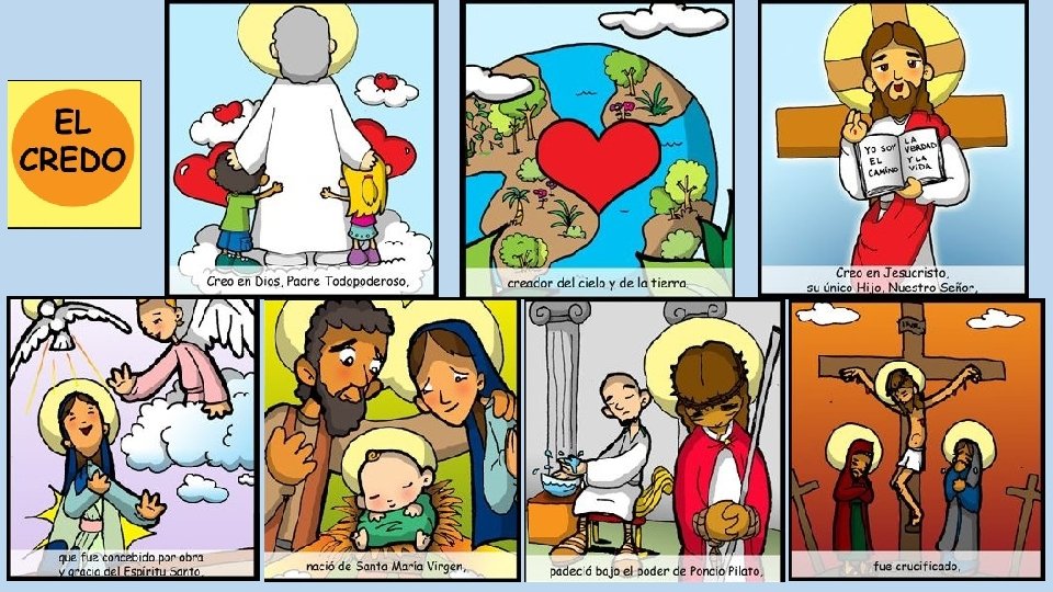 El Credo Creo en Dios, Padre todopoderoso, Creador del cielo y de la tierra. Creo en Jesucristo, su único Hijo, nuestro Señor, que fue concebido por obra y gracia del Espíritu Santo, nació de santa María Virgen, padeció bajo el poder de Poncio Pilato, fue crucificado, muerto y sepultado, descendió a los infiernos, al tercer día resucitó de entre los muertos, subió a los cielos y está sentado a la derecha de Dios, Padre todopoderoso. Desde allí ha de venir a juzgar a vivos y muertos. Creo en el Espíritu Santo, la santa Iglesia católica, la comunión de los santos, el perdón de los pecados, la resurrección de la carne y la vida eterna. Amén.