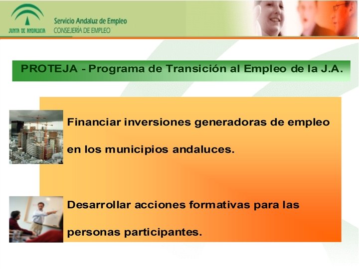 102 profesionales altamente cualificados, expertos en mercado de trabajo. (Equipos multidisciplinares) Actúan en: 10 grandes ciudades Andaluzas Características: -Más de 100. 000 habitantes. -Elevada tasa de desempleo. -Escaso uso y/o aprovechamiento de los recursos públicos de empleo. -Escasa motivación de la población desempleada. - Presencia de tejido asociativo.