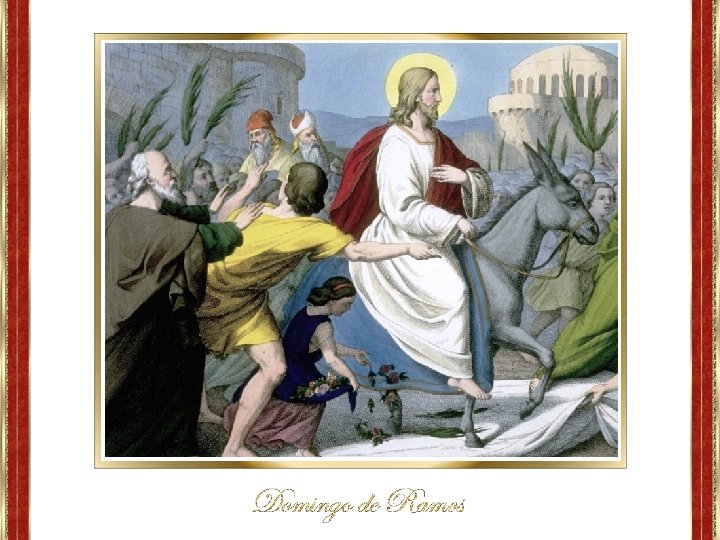 Jesús entra humildemente en un burro, cumpliendo la profecía de Zacarías 9, 9 ¡Alégrate mucho, hija de Sión!