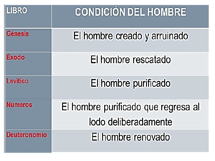 GÉNESIS La historia de la creación del mundo y el género humano ÉXODO -La vida del pueblo de Israel en Egipto: LEVÍTICO -Normas para el desarrollo de las funciones litúrgicas y todos -su liberación, los servicios en el La historia de los -peregrinación Patriarcas hasta el monte tabernáculo, Sinaí y - - la adoración en -Leyes e el tabernáculo instrucciones para que el pueblo de vida en santidad. -Énfasis capacitar a los encargados de ofrecer sacrificio y guiar adoración que el pueblo rendía a Dios. - NÚMEROS El pueblo frente al monte Sinaí preparándose para reiniciar la marcha después de haber permanecido ahí por más de un año. Las jornadas de Cades Barnea y finalmente al monte Moab. 39 años-. DEUTERONOMIO -Serie de discursos de Moisés en los cuales el gran líder se despide, pues ya eran los últimos días de su ministerio entre ellos. -Les hace un recuento reflexivo de la peregrinación por el desierto. -Repite muchas de las instrucciones y leyes q había recibido.