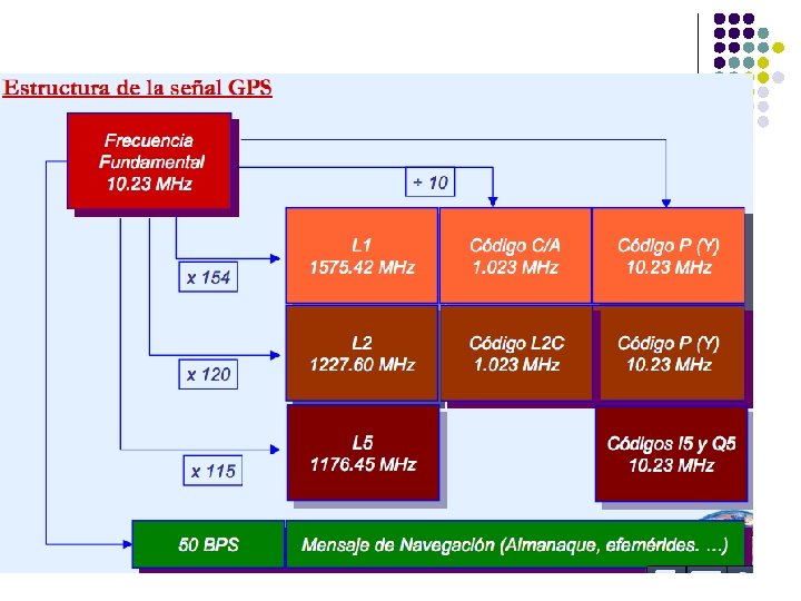 Las mejoras en las señales l l l Incorporación de una señal L 2 C (C de Civil) no encriptada a partir de los satélites del Bloque IIR M Incorporación de una señal L 5 de libre disponibilidad a partir de los satélites del Bloque II F En estudio una nueva señal L 1 C, Bloque III