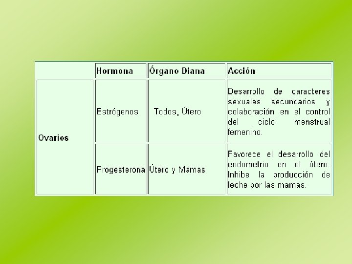 GLÁNDULAS SEXUALES O GÓNADAS Las gónadas (testículos y ovarios) son glándulas mixtas que en su secreción externa producen gametos y en su secreción interna producen hormonas que ejercen su acción en los órganos que intervienen en la función reproductora. Cada gónada produce las hormonas propias de su sexo, pero también una pequeña cantidad de las del sexo contrario. El control se ejerce desde la hipófisis. Ovarios: Los ovarios son los órganos femeninos de la reproducción, o gónadas femeninas. Son estructuras pares con forma de almendra situadas a ambos lados del útero. Los folículos ováricos producen óvulos, o huevos, y también segregan un grupo de hormonas denominadas estrógenos, necesarias para el desarrollo de los órganos reproductores y de las características sexuales secundarias, como distribución de la grasa, amplitud de la pelvis, crecimiento de las mamas y vello púbico y axilar.