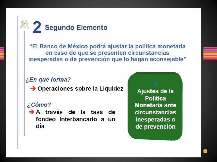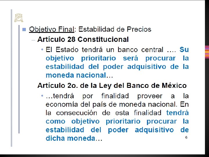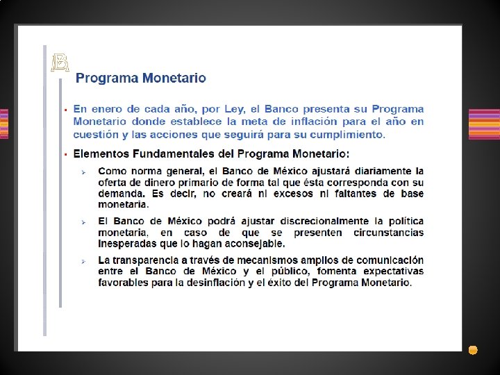 POLÍTICA MONETARIA EN MÉXICO • El objetivo prioritario del Banco de México es procurar la estabilidad de precios. • A partir de que se adoptó un régimen de tipo de cambio flexible a fines de 1994, la política monetaria ha evolucionado hacia un esquema de objetivos de inflación, el cual está fincado en 4 pilares: 1. Comprensión de las causas del proceso inflacionario y de los requisitos para lograr la estabilidad de precios. 2. Establecer metas explícitas de inflación para el corto y mediano plazos. 3. Evaluación permanente de las presiones inflacionarias como fundamento para una implementación preventiva de la política monetaria. 4. Establecimiento de mecanismos de comunicación con el público.