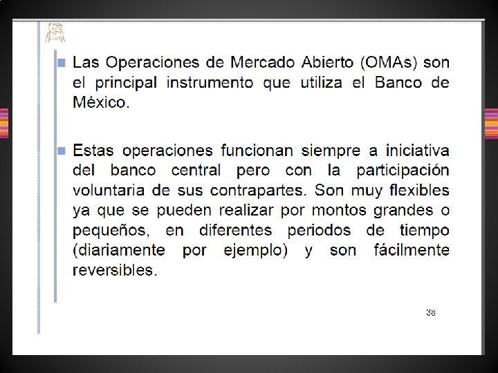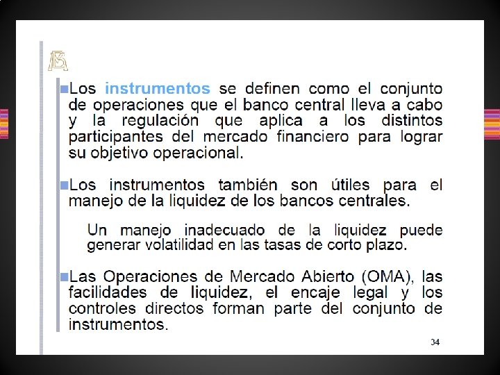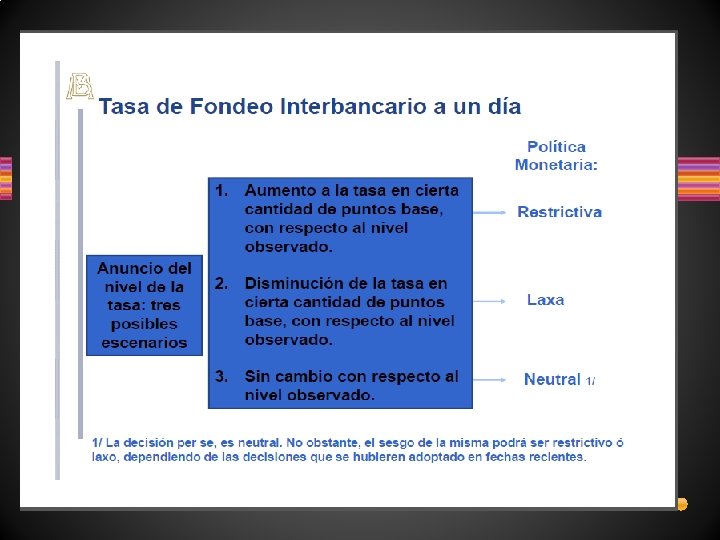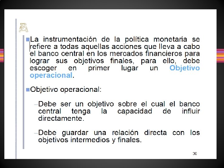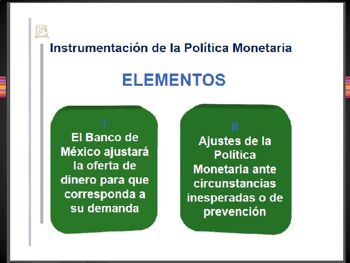 ¿QUÉ ES UNA POLÍTICA MONETARIA? • Es una política económica que usa la cantidad de dinero como variable de control para asegurar y mantener la estabilidad económica. • Las autoridades monetarias usan mecanismos como la variación del tipo de interés, y participan en el mercado de dinero. • Los bancos centrales son responsables de proveer de moneda y de instrumentar la política monetaria. • La política monetaria está asociada al conjunto de acciones que determinan las condiciones bajo las cuales proporciona el dinero que circula en la economía, lo cual influye en el comportamiento de la tasa de interés de corto plazo.
