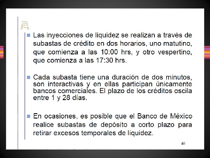 TIPOS DE POLÍTICA MONETARIA • La política monetaria puede ser: -EXPANSIVA: Se aplica cuando en el mercado hay poco dinero en circulación y se quiere aumentar la cantidad. Mecanismos: *Reducir la tasa de interés, para hacer más atractivos los préstamos bancarios. *Reducir el coeficiente de caja, para poder prestar más dinero. *Comprar deuda pública, para aportar dinero al mercado. -RESTRICTIVA: Se aplica cuando en el mercado hay mucho dinero en circulación y se quiere reducir la cantidad. Mecanismos: *Aumentar la tasa de interés, para que pedir un préstamo sea más caro. *Aumentar el coeficiente de caja, para dejar más dinero en el banco y menos en circulación. *Vender deuda pública, para quitar dinero del mercado cambiándolo por títulos.