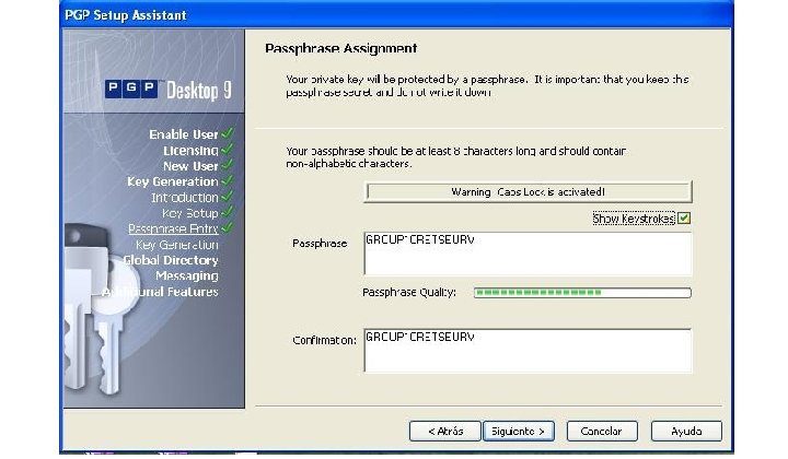 Ejemplos de confianza – Si varias personas confianza parcial firman un certificado de otra persona y todos contienen la misma llave pública, PGP le asigna confianza total al nuevo certificado. – Si un certificado no cuenta con la confianza total, se puede verificar una firma digital de esa persona y se le puede mandar mail cifrado, pero PGP muestra una advertencia.