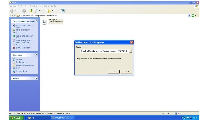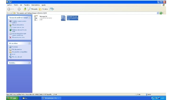 PGP en el destinatario Clave simétrica MENSAJE ENCRIPTADO Certificado Descifra el mensaje, el certificado y la firma mediante la clave simétrica TE ENVIO UNA COPIA DE LA FACTURA Firma digital