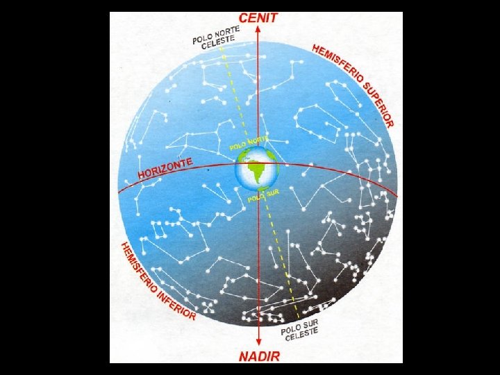 La Esfera Celeste • • • Al observar el cielo desde la tierra, éste asemeja una gran bóveda o esfera, que recibe el nombre de “esfera celeste”, conteniendo a los astros en su interior, los que a simple vista parecen estar a una misma distancia del observador. La prolongación de una vertical al punto más alto de la esfera celeste recibe el nombre de cenit. Asimismo la prolongación de una vertical hacia abajo o punto opuesto, se lo conoce como nadir. El círculo máximo de la esfera celeste, situado a una misma distancia del cenit y nadir y a 90º (perpendicular) recibe el nombre de horizonte (“el contorno”). Este horizonte divide a la esfera en dos partes iguales o hemisferios, el hemisferio superior o visible y hemisferio inferior o invisible. La esfera celeste posee dos polos celestes, los cuales son las proyecciones de los polos geográficos.