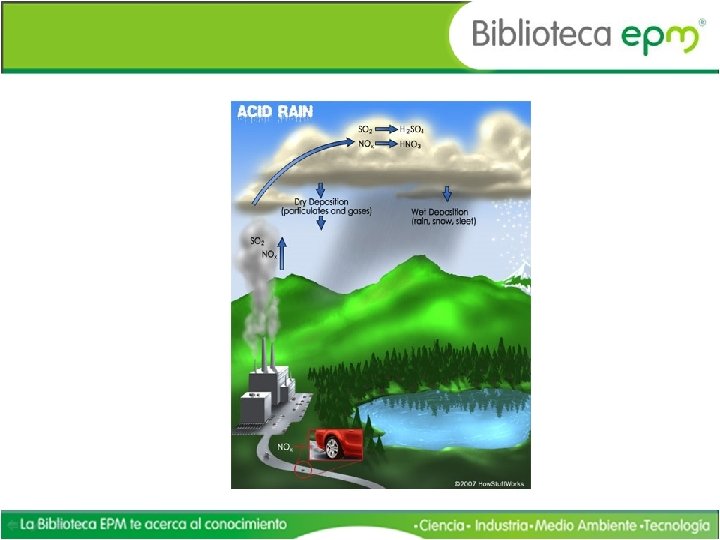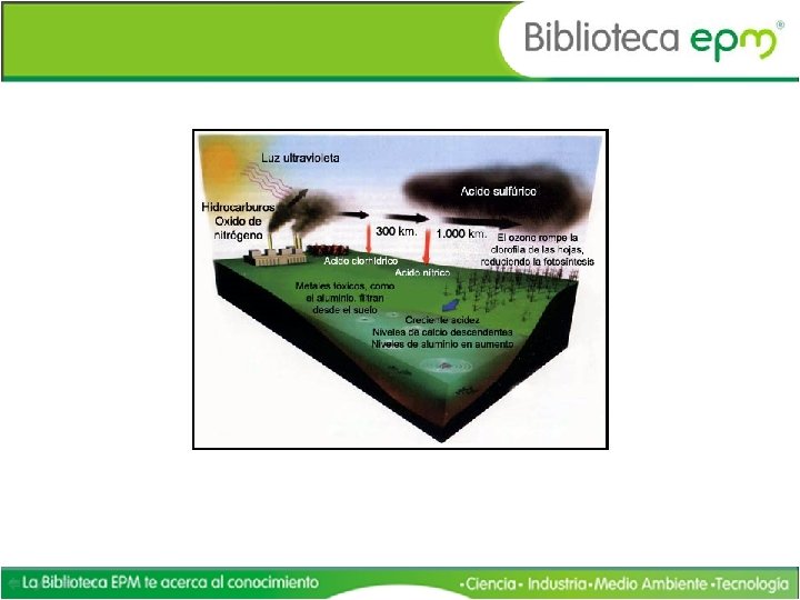 Lluvia Ácida • • • Fenómeno de contaminación atmosférica que se produce como consecuencia de la presencia de compuestos de azufre en suspensión en el aire. El anhídrido sulfuroso (dióxido de azufre), procedente principalmente de los residuos emanados de los combustibles, y los óxidos de nitrógeno reaccionan con el agua presente en las capas altas de la atmósfera en forma de pequeñas partículas en suspensión, formando ácido sulfúrico y ácido nítrico, respectivamente. Estas partículas, que reciben el nombre de «depósito seco» , pueden ser transportadas a grandes distancias desde su punto de origen, precipitándose en forma de lluvia ácida sobre la vegetación y filtrándose en el suelo, con la consecuencia de una progresiva deforestación. El fenómeno de la lluvia ácida no es nuevo. El término fue acuñado en 1872 por Robert Angus Smith, un químico británico que estudió los efectos de la contaminación atmosférica sobre la ciudad de Manchester durante la revolución industrial. En Aire y lluvia expuso la evidencia de la degradación ambiental sufrida por la vegetación, la piedra y el hierro, a causa de la presencia de altas cantidades de ácido en suspensión en el aire. A pesar del valor de sus hallazgos, el fenómeno de la lluvia ácida fue olvidado hasta los años sesenta, cuando, debido al aumento creciente de los procesos industriales, se evidenciaron sus nefastas consecuencias para la vegetación y el suelo. Los efectos nocivos de la lluvia ácida acaban por determinar la supervivencia de las masas forestales en Europa y América del Norte, donde grandes regiones arbóreas han sufrido una degradación irreversible. En los países industrializados, la mayor parte del ácido sulfúrico procede de la combustión del carbón, del petróleo y del gas de las centrales eléctricas y de las calderas domésticas. La acidez del agua de lluvia, que se mide en la escala del p. H, es normalmente de 5, 6; pero en las regiones afectadas por la lluvia ácida el nivel de p. H puede superar hasta diez veces la acidez del agua. En consecuencia, la vegetación sufre un fenómeno de degeneración que le lleva a la muerte. Pero el efecto de la lluvia ácida va más allá y acaba por contaminar al propio suelo, que por efecto de la filtración del ácido en las capas freáticas y los cursos de agua, ríos y lagos, conlleva en su entorno la muerte de toda forma de vida.