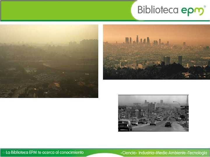 El smog • Esta niebla densa y oscurecida "smog", es una mezcla de niebla, humo y vapores que provienen de productos químicos. Es un tipo de polución atmosférica concentraciones de óxido de sulfuro y de nitrógeno, hidrocarburos y millones de partículas de plomo, manganeso, cobre, níquel, cinc y carbón. Todos estos gases provienen de las industrias, de los automóviles e incluso de los hogares como resultado de procesos de combustión. En la actualidad se identifican dos tipos de smog: el fotoquímico y el sulfuroso o reductor.