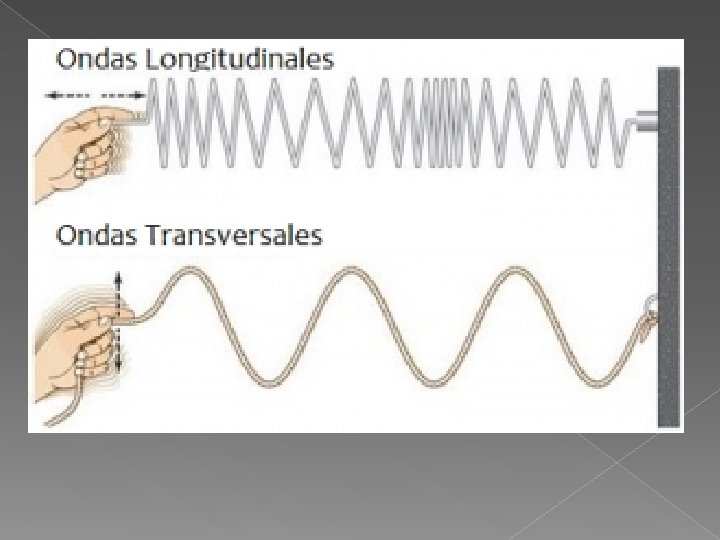 Según la dirección del movimiento de las partículas: Ondas transversales: La dirección de propagación es perpendicular al de la oscilación. Ejemplo: Las ondas generadas en la vibración de cuerdas en instrumentos musicales. Las ondas que se generan en las superficies de los líquidos. En los estadios, surgió una moda de participación del público, generando una especie de onda que se propagaba a través de las personas, para lo cual se levantaban y alzaban los brazos en un orden secuencial, lo que daba la impresión de una onda propagándose a través de ellos. Ondas longitudinales: La dirección de propagación coincide con la oscilación. Ejemplo 1: Si generamos una onda longitudinal en un resorte, de tal forma que, comprimiendo un conjunto de espiras en uno de sus extremos, dichas compresiones se transmitirán a lo largo del resorte mediante procesos de compresión y descompresión de las partículas al paso de la onda. El sonido se propaga en el aire como una onda longitudinal, como producto de las sucesivas compresiones y descompresiones de las moléculas de aire.