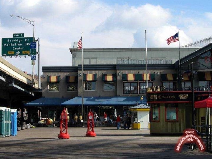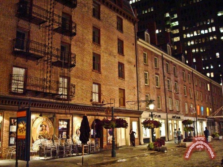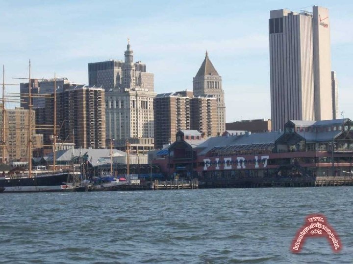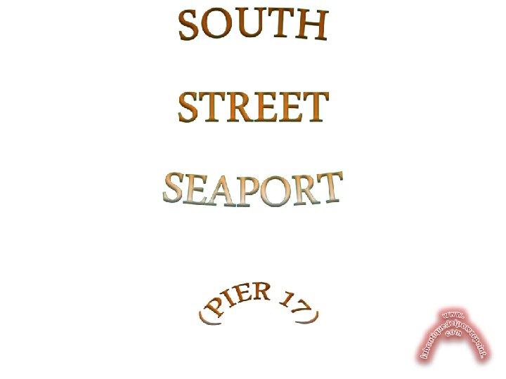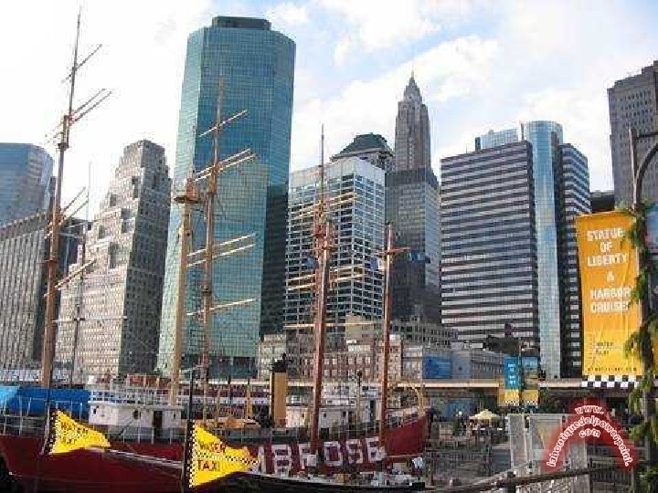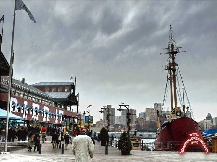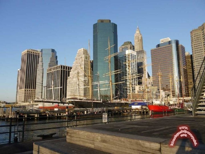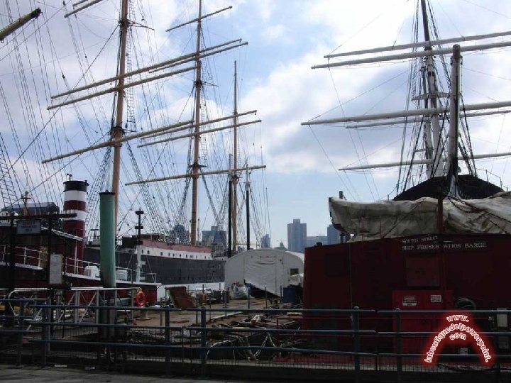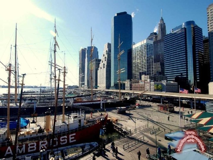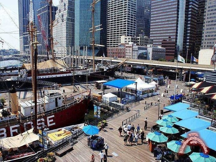 El South Street Seaport ( Pier 17) es una zona histórica en la Ciudad de Nueva York, municipio de Manhattan, está ubicado en Fulton Street a orillas del East River, junto al Distrito Financiero. El puerto se considera generalmente como un distrito histórico, distinto de su vecino distrito financiero. Cuenta con algunas de las arquitecturas más antiguas del centro de Manhattan, e incluye la mayor concentración de principios del siglo 19 con restauración de edificios comerciales del siglo, incluyendo también renovación de edificios mercantiles originales, barcos de vela, y centros turísticos modernos con comidas, compras y vida nocturna, coincidiendo con el final del Puente de Brooklyn Historia El South Street Seaport Museum fue fundado en 1967 por Peter y Norma de Stanford. Cuando se abrió inicialmente como un museo, el centro de conservación del Museo del Puerto iba a ser un sitio histórico educativo, con "tiendas" en su mayoría reproduciendo los entornos de trabajo que había durante el apogeo del puerto de - 1820 a 1860. Designado Museo Marítimo por el Congreso Nacional de los Estados Unidos, en 1998, el South Street Seaport Museum se encuentra en la Plaza 12 del bloque del distrito histórico del puerto original de Nueva York. El museo cuenta con más de 30. 000 pies cuadrados (2. 800 m 2) De espacio de exposición y de educación, alberga salas de exposiciones, una imprenta del siglo 19, un museo de arqueología, una biblioteca marítima, un centro artesanal, un laboratorio de conservación de la vida marina, y la mas grande flota privada de naves históricas del país. Se incluyen en esta flota: • Pekín, Una barca de cuatro mástiles de 1911 ³ • Wavertree, ³ Un buque de carga de 1885, totalmente restaurado • Pioneer, Una goleta de 1885 ¹ ³ • Lettie G. Howard, Una goleta de 1893 ¹ ² • Ambrosio, Un faro ² de 1908 • Helen Mc. Allister, Un remolcador de 1900 • W. O. Decker, Un remolcador 1930 ¹ ³ • Marion M. , Un navío ligero de 1932 ¹ Durante el clima favorable, estos buques navegan con público en las vías fluviales de Nueva York. ² Estos buques han sido designados Monumentos históricos nacionales por el Servicio de Parques Nacionales. ³ Estos buques han sido enumerados en el Registro Nacional de lugares históricos por el Servicio de Parques Nacionales En las diapositivas con texto, para avanzar, pulsar el ratón