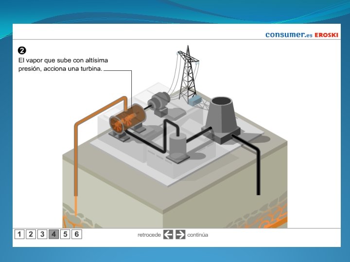 FUNCIONAMIENTO Básicamente, una central geotérmica consta de una perforación realizada en la corteza terrestre a gran profundidad. Para alcanzar una temperatura suficiente de utilización debe perforarse varios kilómetros; la temperatura aproximada a 5 kilómetros de profundidad es de unos 150º centígrados. El funcionamiento se realiza mediante un sistema muy simple: dos tubos que han sido introducidos en la perforación practicada, mantienen sus extremos en circuito cerrado en contacto directo con la fuente de calor. Por un extremo del tubo se inyecta agua fría desde la superficie, cuando llega a fondo se calienta y sube a chorro hacia la superficie a través del otro tubo, que tiene acoplado una turbina con un generador de energía eléctrica. El agua fría enfriada es devuelta de nuevo por el primer tubo para repetir el ciclo.