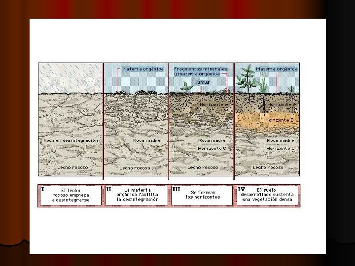 LA FORMACIÓN DEL SUELO 1 - El suelo se apoya sobre la roca y se forma a partir de ella, que, por esta razón, se denomina roca madre. l 2 - La capa de roca disgregada empieza luego a ser colonizada por los seres vivos. l 3 - Los restos de estos animales y plantas sirven de alimento a algunas bacterias y hongos, que los descomponen y transforman en compuestos más simples. l