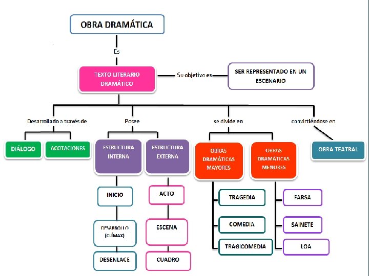 Estructura externa ACTO ESCENA • Se define como cada una de las unidades mayores en que se divide la forma externa de un drama. • Se reconoce, tradicionalmente, con la caída del telón. • Fragmento del drama cuyo principio y fin están determinados por la entrada y salida de personajes. CUADRO • División de la obra dramática en su forma externa, más breve que el acto. • Se relaciona con la ambientación física. Los cambios de la escenografía en la puesta en escena, indican los distintos cuadros.