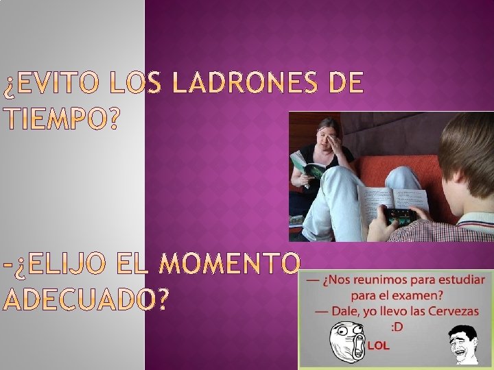 6 RELAJACIÓN Necesitas dormir o descansar. Hay que tomar descansos. 7 “NO” A veces hay que anteponer tu propio tiempo al de los demás. 8 TIEMPO PARA TU “DIARIO DE ABORDO” Revisar cómo gastas el tiempo. 9 LEY DE PARKINSON Cualquier trabajo se expande hasta agotar el tiempo destinado a que se haga. Preparar un plan de trabajo. 10 RECOMPENSAS Pasear, ver TV, oír música…