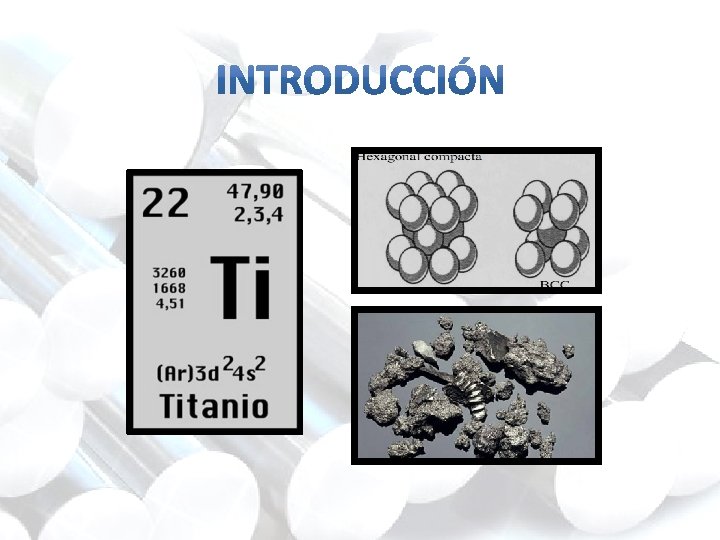 • Titanio (Ti), elemento químico de número atómico 22 situado en el grupo 4 de la tabla periódica. • Cuarto material metálico más abundante en la corteza terrestre. • Encontrada en forma de óxido (escoria, cenizas). • Obtención costosa (uso limitado).
