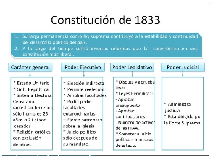 Analizo la Constitución de 1833. Con ayuda de tu texto y guía de apoyo responde en tu cuaderno. 1. - ¿Por qué se dice que la constitución de 1833 es marcadamente presidencialista y a la vez tenía un matiz parlamentario? Fundamenta. 2. -¿Qué eran las Leyes periódicas y a qué Poder del Estado le correspondía aprobarlas? 3. -¿En qué consistía la facultad del Presidente de la República de ejercer el Derecho de Patronato? 4. - ¿Quiénes eran ciudadanos según la Constitución? 5. - ¿En qué consiste el Voto Censitario de la época?