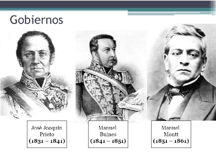 La obra de los gobiernos Conservadores (1831 -1861) Los gobiernos conservadores o «decenios» de la república Autoritaria consolidaron la estabilidad política, el crecimiento económico, el aseguramiento de la soberanía nacional y la expansión de la cultura. José Joaquín Prieto 1831 -1841 -Promulgación de la Constitución de 1833. -Creación del Ministerio de Justicia, Culto e instrucción Pública. -Guerra contra la Confederación Perúboliviana. Manuel Bulnes 1841 -1851 -Toma de posesión de Magallanes. -Ley de colonización en Valdivia y Llanquihue. -Fundación de la Quinta Normal y la Universidad de Chile. -Escuela normal de Preceptores Manuel Montt 1851 -1861 -Extensión de líneas ferroviarias. -Ley de bancos. -Promulgación del Código Civil. -Ley de instrucción Primaria. -Avance educacional.
