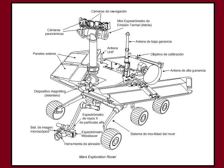 Instrumentos que se emplearán 1. Dos cámaras panorámicas. ( para obtener imágenes del terreno) 2. Cuatro cámaras de evitación de riesgos. (para evitar que choque) 3. Dos cámaras de navegación. (vistas tridimencionales del terreno) 4. Sistema de imagen microscópica y cámara CCD. 5. Herramienta de Abración de rocas. (para eliminar la cubierta de estas) 6. Espectrómetros de Emisión Termal en miniatura. ( imagen infrarroja) 7. Los Espectrometros Mossbaur (detecta el hierro en las rocas) 8. Los Espectometros de Rayos X y de Protones Alfa. (Conc. de elementos) 9. Sistemas magnéticos ( para recoger polvo atmosférico)