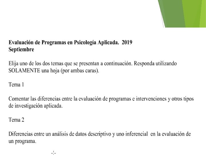 Análisis inferencial Cuando la muestra es la población, desde el punto de vista teórico no tiene sentido aplicar pruebas de significación con los datos, pero puede ser información que sirva para planificar futuras intervenciones. Significación vs. Relevancia En la evaluación de programas son importantes dos tipos de conclusiones: • Necesidad de cuantificar los objetivos en las primeras fases de planificación • Proceso de análisis de datos debe ser completado con un análisis cualitativo y discusión. El hallazgo de diferencias estadísticamente significativas en muestras muy pequeñas o muy grandes pueden llevar a errores en la interpretación y valoración de los resultados obtenidos. La estimación por intervalos puede ser considerada una alternativa que permite evaluar la presencia del cambio y la magnitud del efecto.