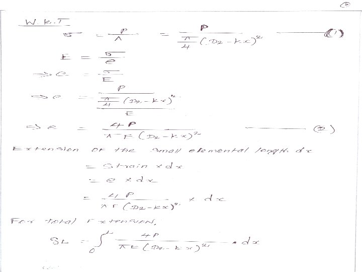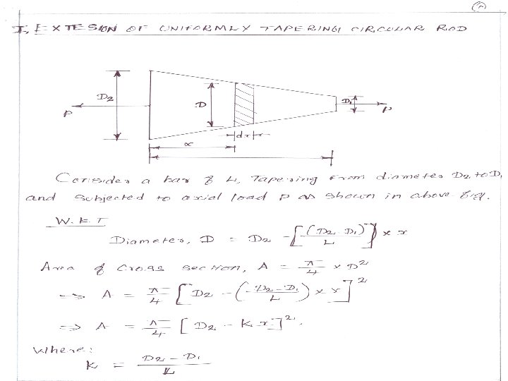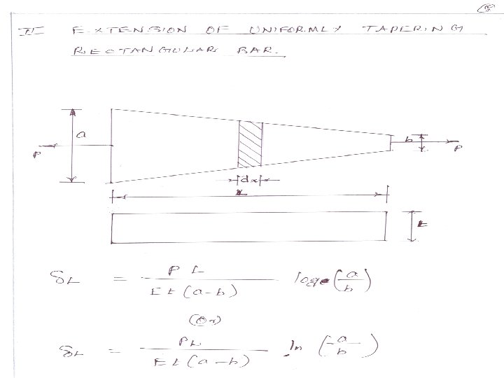 Problems: 1. A circular rod 2. 5 m long, tapers uniformly from 25 mm diameter to 12 mm diameter. Determine the extension of the rod under a pull of 30 kn. Assume modulus of elasticity of the rod is 200 kn/mm 2. A steel flat plate ab of 1 cm thickness tapers uniformly. from 10 cm to 5 cm width in a length of 40 cm. Determine the elongation of the plate, if an axial tensile force of 5000 N acts on it. Take E =2 × 105 N/mm 2.