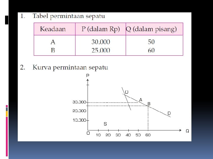 Harga sepatu Rp 30. 000, - pasang, jumlah yang diminta 50 pasang. Ketika harga turun menjadi Rp 25. 000, - per pasang jumlah yang diminta 60 pasang. Pertanyaan: 1. Buatlah tabel permintaan sepatu! 2. Buatlah kurva permintaan sepatu! 3. Tentukan koefisien elastisitas permintaan sepatu! Jawab