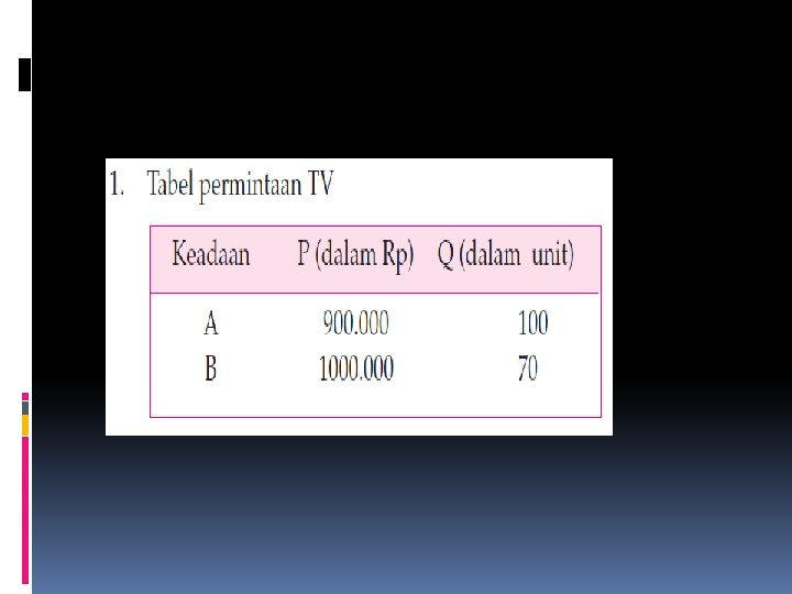 contoh Ketika harga TV Rp 900. 000, - per unit, jumlah yang diminta 100 unit. Dan jumlah yang diminta turun menjadi 70 unit ketika harga naik menjadi Rp 1. 000, -. Pertanyaan: 1. Buat tabel permintaan TV. 2. Buat kurva permintaan TV. 3. Tentukan koefisien elastisitas permintaan TV.