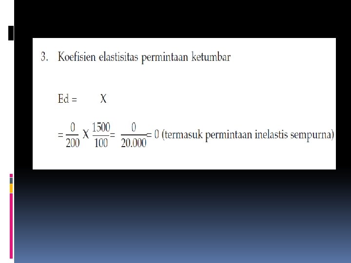 d. Permintaan Inelastis Sempurna Permintaan in elastis sempurna terjadi bila persentase perubahan permintaan sebesar 0 % sedang persentase perubahan harga sebesar X%. Dengan kata lain, walau harga berubah X%, permintaan tetap tidak berubah (0%). Permintaan ini ditunjukkan dengan koefisien (Ed) yang besarnya sama dengan 0, diperoleh dari Ed = = 0. Barang yang sifat permintaannya inelastis sempurna adalah barang yang harganya murah dan relatif tidak penting, seperti ketumbar dan merica. Dari grafik contoh soal 4 terlihat, ternyata berapa pun perubahan harga, tidak memengaruhi jumlah yang diminta.