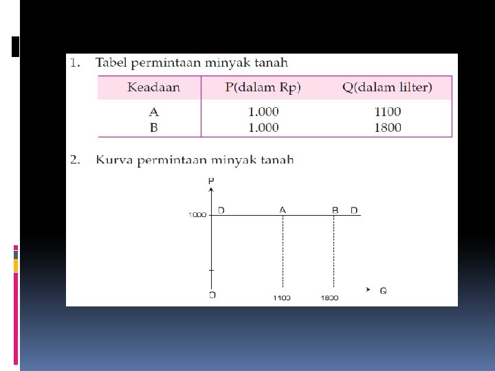 contoh Di pasar kabupaten “A” saat harga minyak tanah Rp 1. 000 perliter jumlah yang diminta 1. 100 liter. Ketika persediaan minyak tanah ditambah menjadi 1. 800 liter pada harga yang sama semua persediaan (1. 800 liter) habis diminta/ dibeli. Pertanyaan: 1. Buat tabel permintaan minyak tanah. 2. Buat kurva permintaan minyak tanah. 3. Tentukan koefisien elastisitas permintaan minyak tanah.