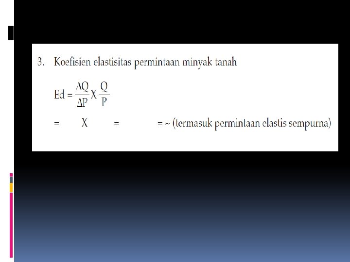 e. Permintaan Elastis Sempurna Permintaan ini terjadi bila persentase perubahan permintaan sebesar X% tetapi persentase perubahan harga sebesar 0% (tidak ada perubahan). Dengan kata lain, walaupun harga tidak berubah, permintaan mengalami perubahan sebesar X%. Permintaan ini ditunjukkan dengan koefisien (Ed) yang besarnya ~, diperoleh dari Ed = = ~ Contoh barang yang bersifat permintaannya elastis sempurna adalah BBM (bahan bakar minya), seperti bensin, minyak tanah, dan lain-lain. Dari grafik tampak, ternyata walaupun harga tidak berubah, permintaan dapat terus mengalami perubahan.