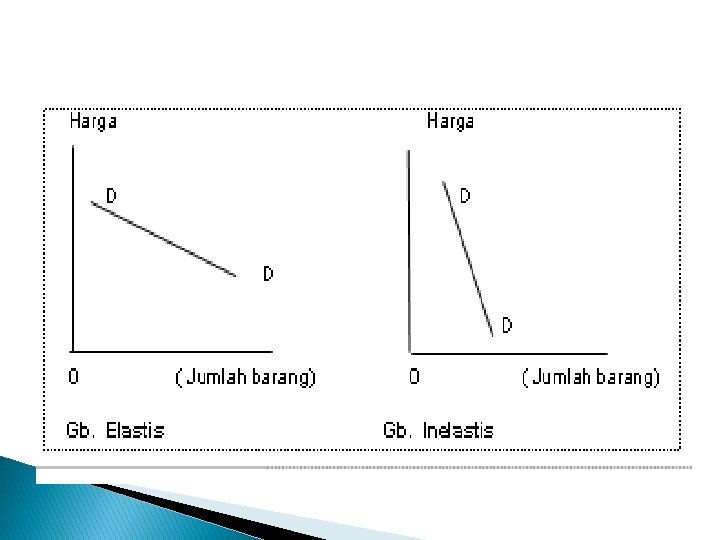 Elastisitas Harga Permintaan � Kecenderungan perubahan permintaan barang X yang disebabkan perubahan harga barang X itu sendiri. Persamaan; Fungsi permintaan; Qdx = 60 -10 Px Titik A B Harga 4 2 Quantitas 20 40