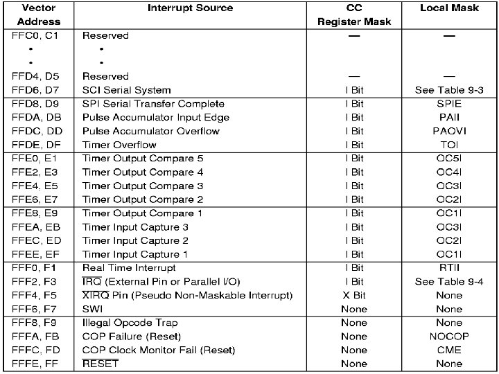 INTERRUPT MASKING: • CLI ; CLear Interrupt Mask • Enable Interrupts on IRQ# line • SEI ; Set interrupt Mask • Disable Servicing of Interrupts on IRQ# line • Interrupt mask does not affect SWI (Software Interrupt) nor XIRQ.