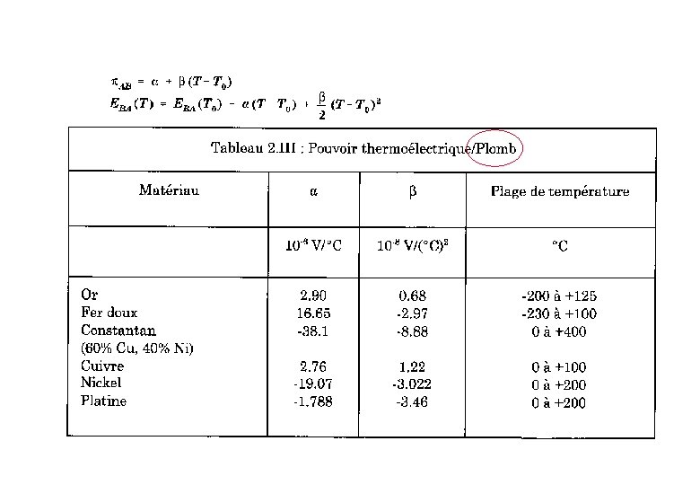 L’effet Seebeck : détermination expérimentale En fait, on ne peut déterminer expérimentalement avec précision que la différence En effet, le voltmètre qui mesure la tension aux bornes d’un circuit est lui-même constitué de conducteurs. Il n’y a un effet que si le circuit comporte plusieurs conducteurs différents. En pratique, pour que le voltmètre donne une mesure objective, il faut qu’il ne soit pas lui-même le siège d’un effet thermoélectrique. Ce sera le cas si ses deux bornes sont constituées du même métal et que sa température interne est uniforme. Note : Si le circuit est à température uniforme, la tension obtenue est nulle. Dommage, car il s’agirait d’un mouvement perpétuel de seconde espèce (ce qui est impossible selon les principes de la thermodynamique).