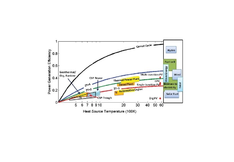 Paramètres intervenant dans l’optimisation d’un dispositif de conversion “The maximum power output per unit area is obtained at a conversion efficiency which is approximately half the value of the attainable maximum conversion efficiency. ” “Because the construction cost is mainly related to the power output per unit area, while the running cost is dependent upon the conversion efficiency, the optimisation of thermoelement length to achieve the minimum total cost will be guided by economic factor. ”