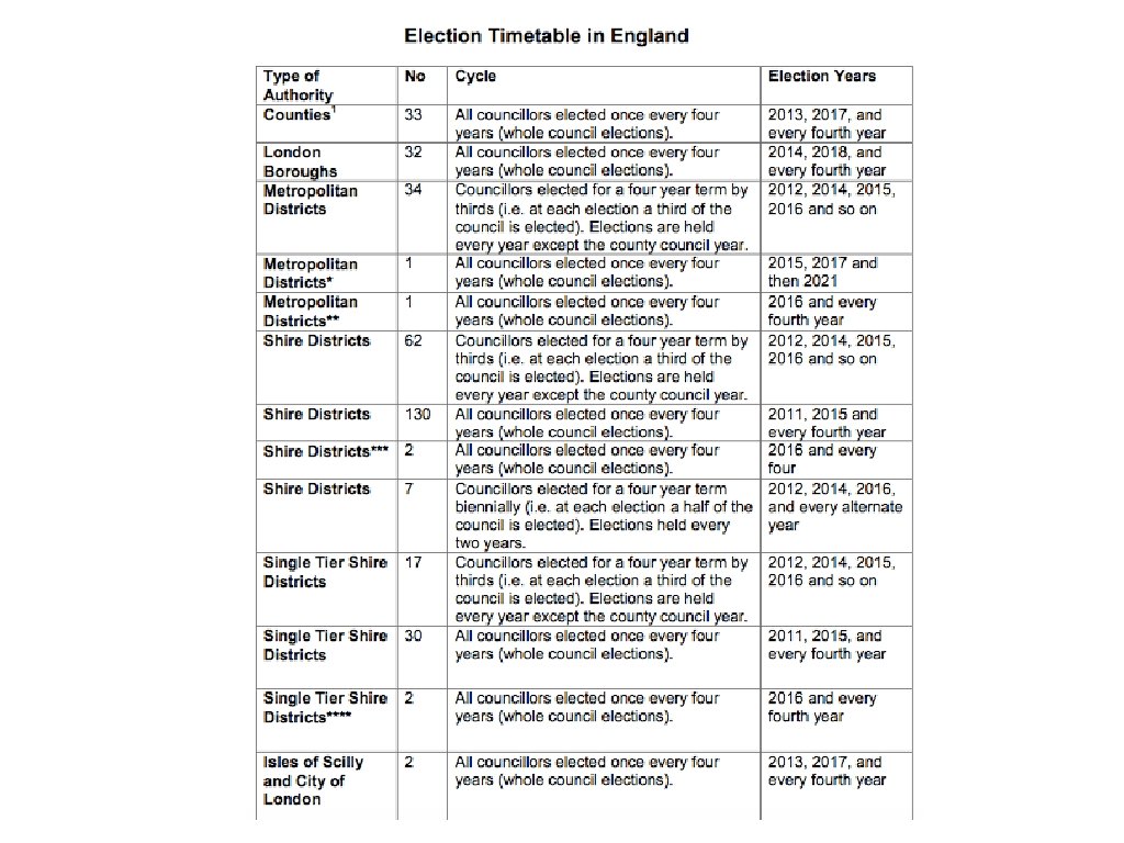 Election Who votes? How often? Other infö… General Election everyone on the electoral register (citizens over 18) before 5 years are up (as of 2011) since 30 s have happened on thursday Local Election electoral register of the local area in question depends! counties and london every 4 yrs, shire district ever yr with 4 yr terms everyone on the European Election electoral register in member states Scottish Parliament Welsh Assembly Northern Ireland Assembly every 5 years 751 MEPs