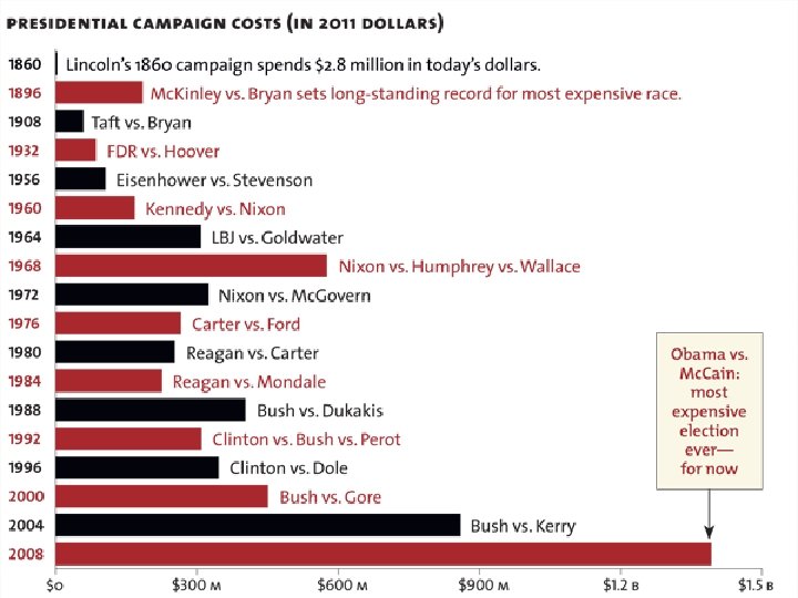 THE ROAD TO THE PRESIDENCY � “Test the waters” Visit talk shows � make appearances in first two primary states IA and NH � Form an exploratory committee to assess verbal and monetary support � � Create a campaign organization without the aid of the major political parties Fundraising, grassroots (especially in early primary states) � Once candidate becomes the nominee, then the party rallies behind the candidate with money and other forms of support �