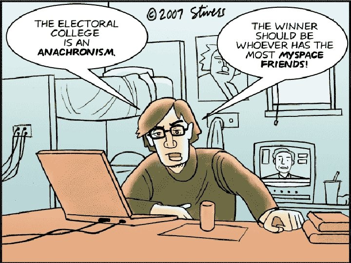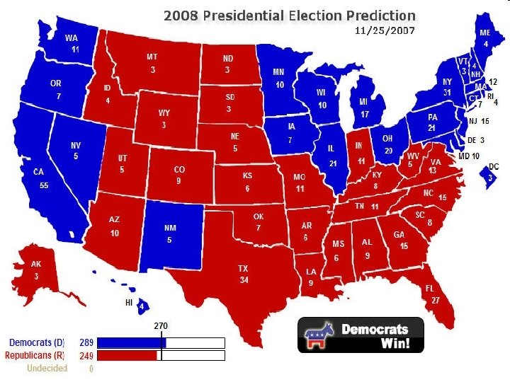 PRESIDENTIAL ELECTION � After the National Convention, candidates promote the platform of each party in an attempt to win the general election � Campaign � attempt by candidates to convince you to vote for them � Citizens United v. FEC (2010) - Supreme Court case which equated campaign spending to protected 1 st Amendment right of free speech; allows for unlimited expenditures by a candidate if the money comes from political action committees, unions, corporations and interest groups � Vote on the first Tuesday in November � winner take all system; 270 electoral votes needed to