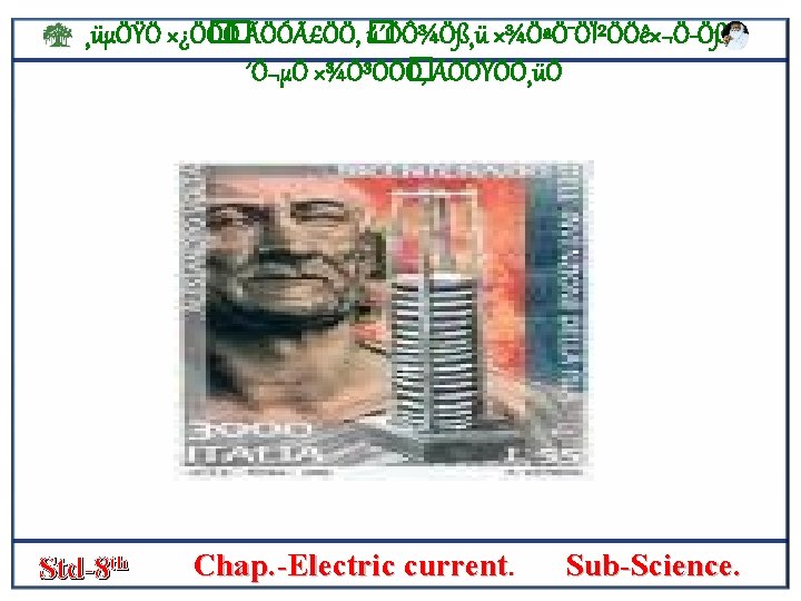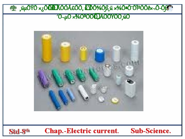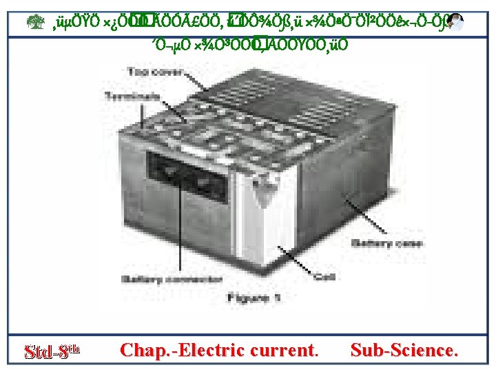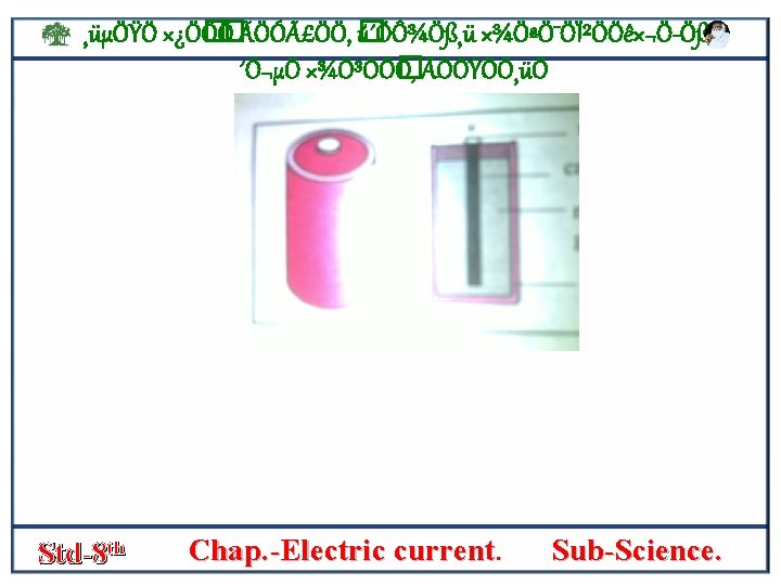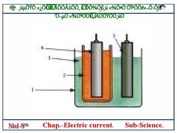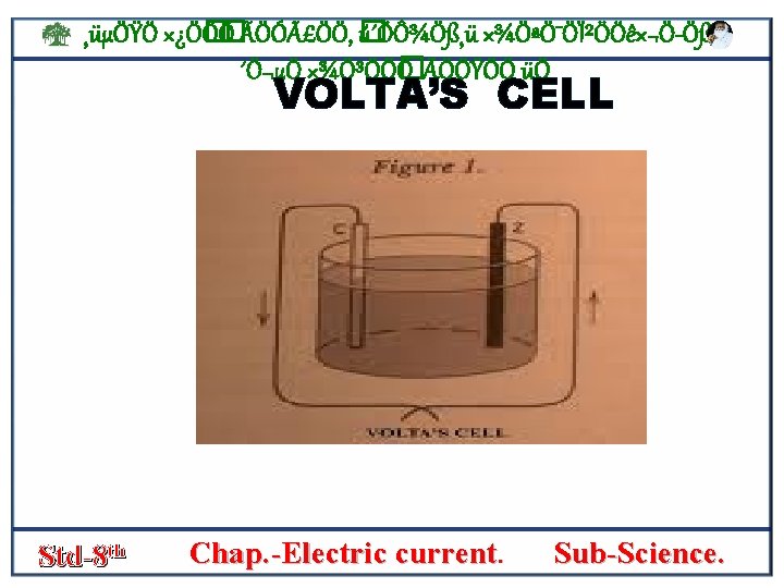 ¸üµÖŸÖ ׿Ö� Ö� Ö ÃÖÓãÖÖ, � ú´ÖÔ¾Ö߸ü ×¾ÖªÖ¯ÖϲÖÖê×¬Ö Öß, ´Ö¬µÖ ×¾Ö³ÖÖ� Ö, ÃÖÖŸÖÖ¸üÖ • SIMPLE Cell- the figure shows that a simple electric cell is connected in an electric cell. • In a trough a plate of zinc [zn] and plate of copper [cu] are stand some distance apart. • The zink plate acts as the negative [-] pole and the copper plate as the positive poleof the cell. s • The circuit includes a bulb and a key which can be opened or closed • The elecric current can be started or stopped by closing or opening the key. this cell is called a volta’s cell. Std-8 th Chap. -Electric current. Sub-Science.