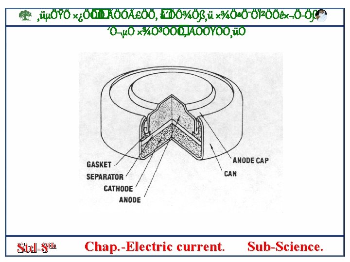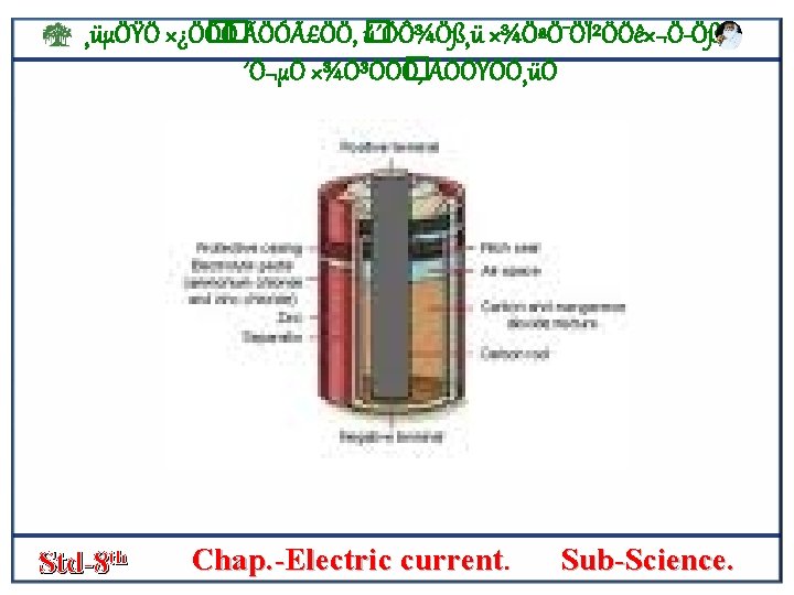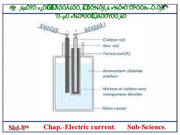 ¸üµÖŸÖ ׿Ö� Ö� Ö ÃÖÓãÖÖ, � ú´ÖÔ¾Ö߸ü ×¾ÖªÖ¯ÖϲÖÖê×¬Ö Öß, ´Ö¬µÖ ×¾Ö³ÖÖ� Ö, ÃÖÖŸÖÖ¸üÖ Is filled with a moist paste of zink chloride [zncl 2] and ammonium chloride [nh 4 cl]. then, the carbon rod is fitted with a metal s cap and the cell is sealed. Std-8 th Chap. -Electric current. Sub-Science.