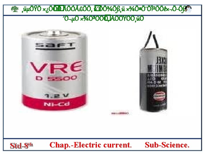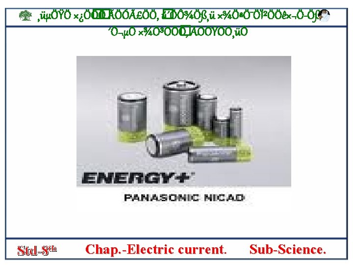 ¸üµÖŸÖ ׿Ö� Ö� Ö ÃÖÓãÖÖ, � ú´ÖÔ¾Ö߸ü ×¾ÖªÖ¯ÖϲÖÖê×¬Ö Öß, ´Ö¬µÖ ×¾Ö³ÖÖ� Ö, ÃÖÖŸÖÖ¸üÖ NICKEL CADMIUM CELL • Nickel cadmium cell is used in drilling machines or some gardening tools. v In this cell the cadmium acts as nigative pole and nickel is positive pole. s v The space between them is filled with the alkali potassium hydroxide. • The cell is made airtight to prevent the leakage and corrosion. • It can be recharged again and again. Std-8 th Chap. -Electric current. Sub-Science.