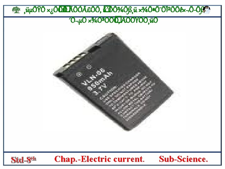 ¸üµÖŸÖ ׿Ö� Ö� Ö ÃÖÓãÖÖ, � ú´ÖÔ¾Ö߸ü ×¾ÖªÖ¯ÖϲÖÖê×¬Ö Öß, ´Ö¬µÖ ×¾Ö³ÖÖ� Ö, ÃÖÖŸÖÖ¸üÖ LECLANCHE’S CELL. • In a cylindrical pot there is a mixture of manganese dioxide and carbon. • A carbon rod placed in it is acts as positive pole and a zinc rod is the nigative pole s • A solution of ammonium chloride is filled in a large glass container and the porous pot and the zinc rod are placed in it. • The chemical reaction between manganese dioxide , zinc and ammonium chloride causes an electric current to flow. Std-8 th Chap. -Electric current. Sub-Science.