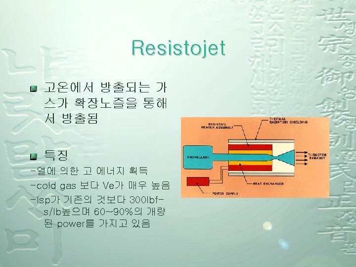Resistojet 2 기술적 관점 -고온에서의 추진체/제질 -heat transfer 와 radiation lose