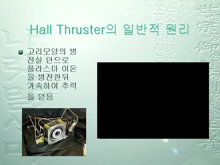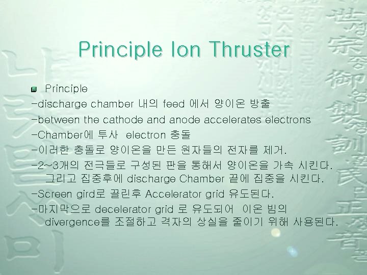Ion Thruster 이득: With high Specific impulse (2, 500~10, 000 lbf -s/lbm) and efficiency(50~75%), low cost , faster planet mission possible 단점: with high power requirements and long service life requirement, complex power system