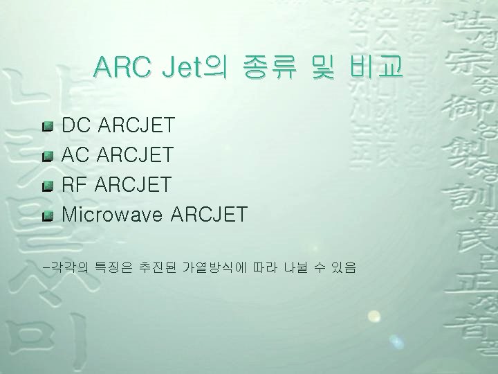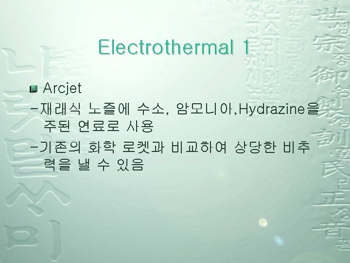 DC ARCJET 2 연료의 선택(page 678) 및 수명 -1. Hydrogen 2. Ammonia 3. Hydrazine -수명은 nozzle 전달되는 열에 의해 파괴될 때 구성