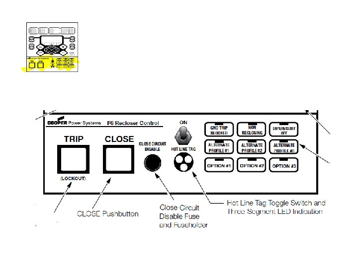 Operation • In single/single mode, pulling down one yellow handle trips and locks out just that unit. • To close, push yellow handle up then hit close button in control. • Non-reclosing will cause just a faulted phase(s) to lockout. • HLT causes all phases to lockout if there is a fault.