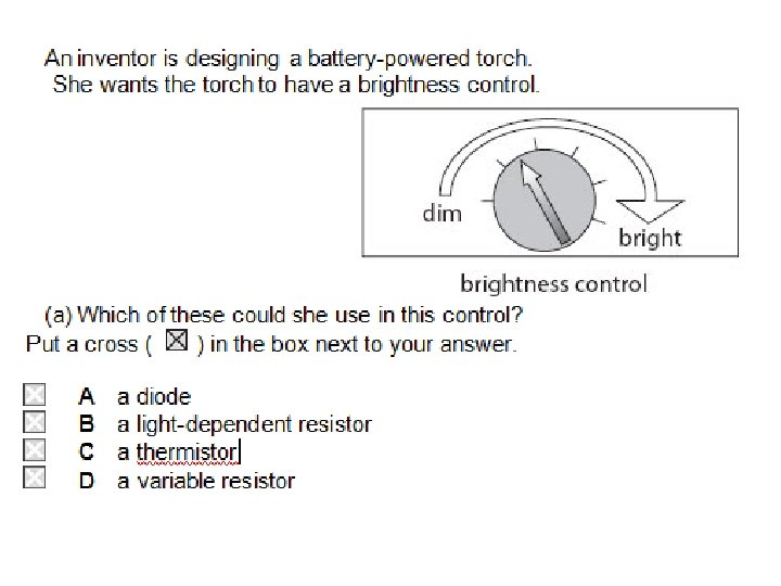 (c)(i point correctly plotted at 2. 0, 0. 14 to within ) half a small square (1) smooth curve of best fit connecting all given points within half a small square (1) (c)(i a description including two of the following: i) · current increases as voltage increases (1) · current is not proportional to the pd (1) · gradient gets less (1) Judge curve by eye. If more than one line present then ignore any that appear to be erased or deleted. Ignore any part of line which goes beyond given points. If plotted point is incorrect then allow ecf for line (2) Allow reverse argument positive correlation (between them ) graph is not a straight line not in equal steps current does not increase as much (as it gets higher) accept resistance has increased with increase in current for two marks (2) (c)(i a suggestion to include: there is still a ii) current (when control is at min position) (1) make the battery last longer (1) to break the circuit to switch the current off accept flow of electricity/charge/electrons for current battery / energy would be drained /used up/ wasted otherwise accept reverse arguments ignore reference to power / volts (2)